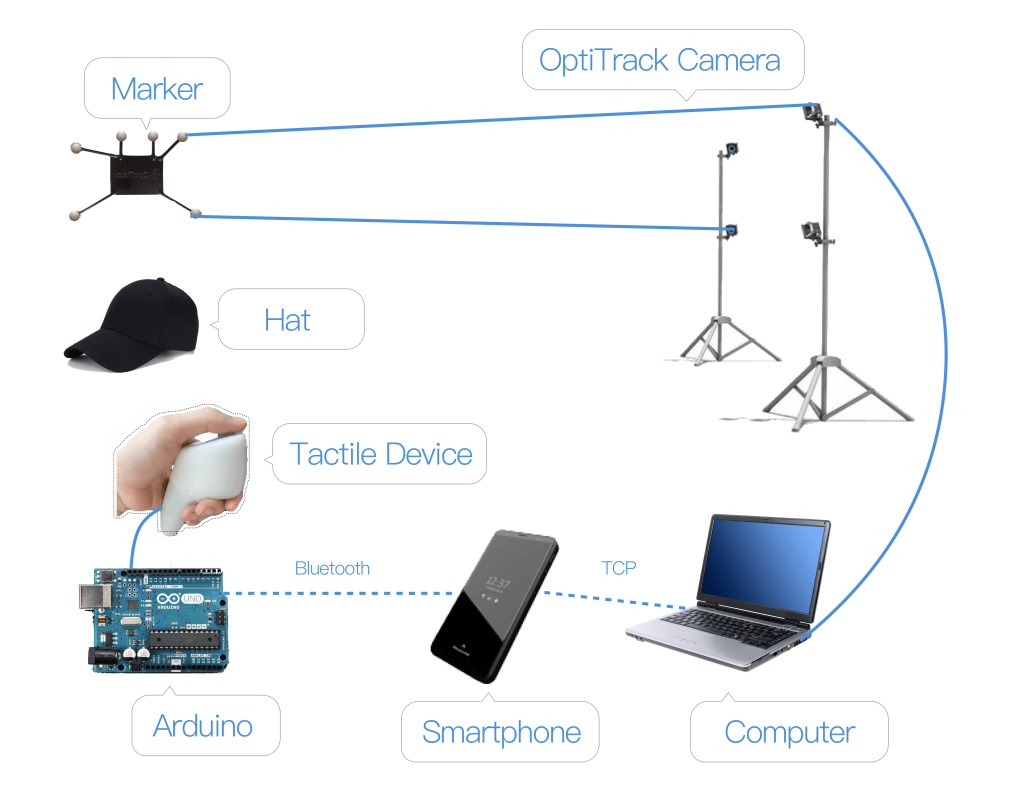 We conducted two lab studies to evaluate the efectiveness of the feedback solution. To conduct the path-following navigation task in the lab, we built an in-lab experimental platform. We used OptiTrack as the locolization system, used the PC server to implement the guidance strategy, and used an application on the Android smartphone as a transfer station between the PC server and the tactile device. The tactile device used Arduino to receive data from the smart-phone and to control the servo motor and the vibration.