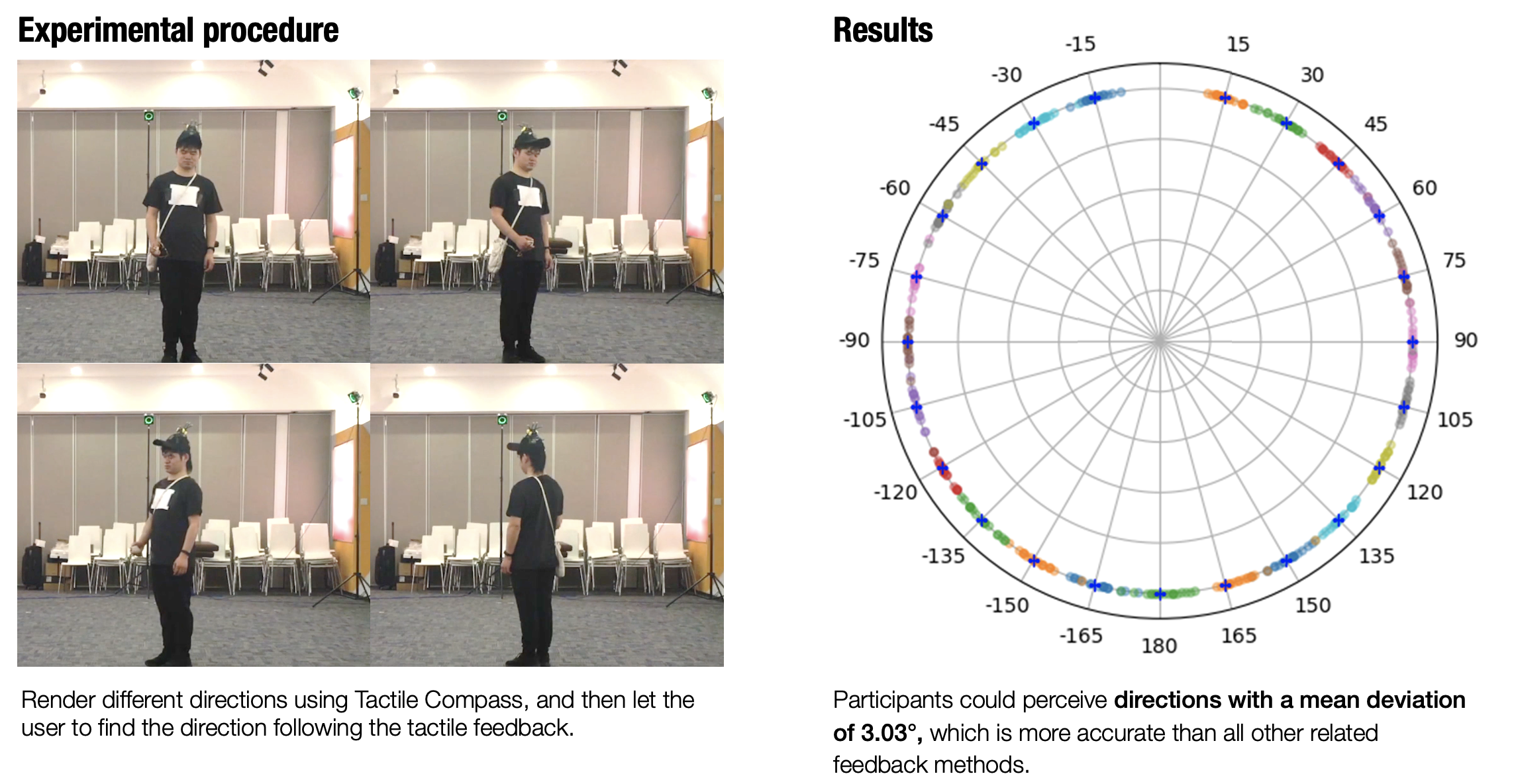 Results showed that, using Tactile Compass, participants could reach the target direction in place with a mean deviation of 3.03° and could smoothly navigate along paths of 60cm width, with a mean deviation from the centerline of 12.1cm. Subjective feedback showed that Tactile Compass was easy to learn and use.
