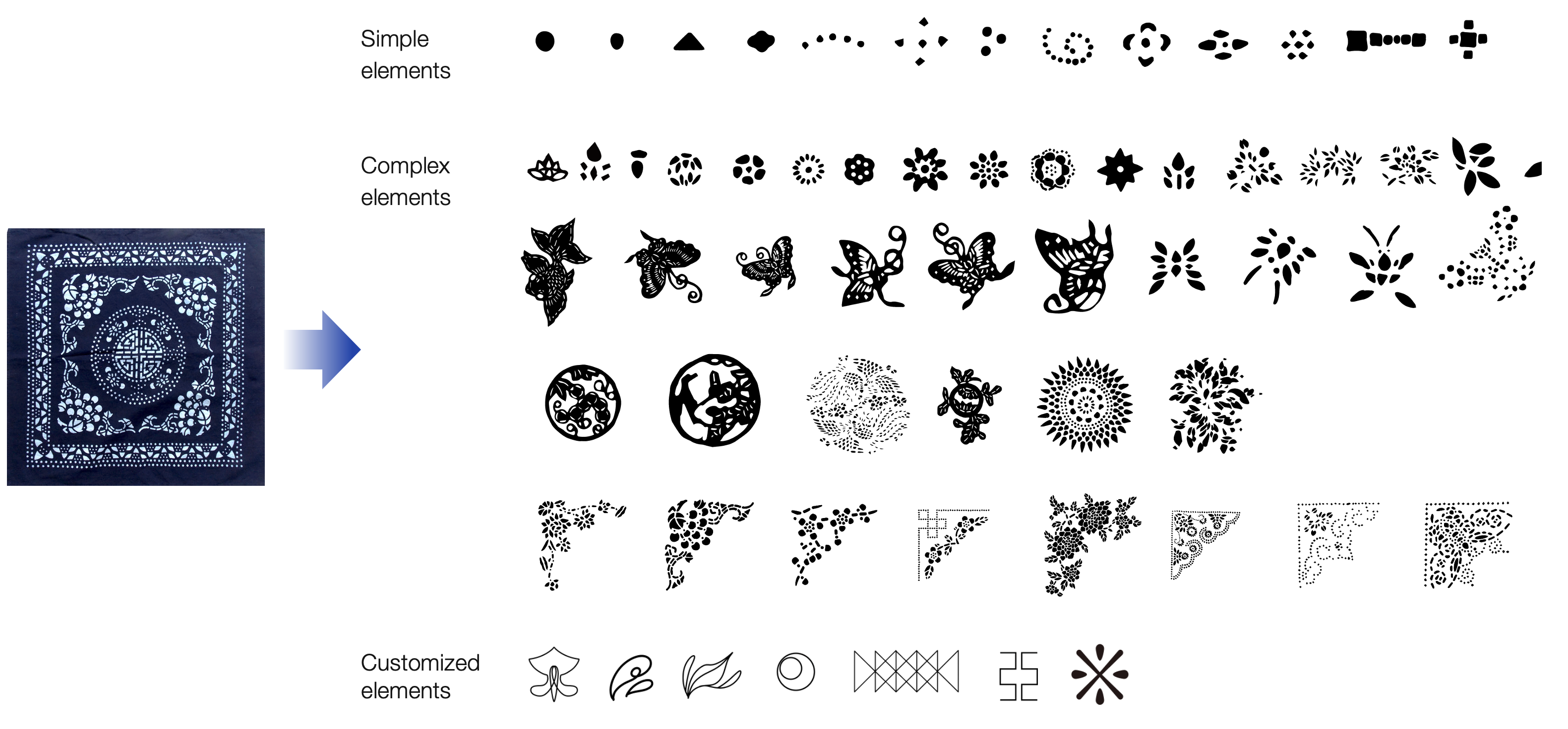 Using the design tool, users can easily choose the elements and compositions and generate their customized calico patterns with the distinctive traditional Blue Calico style. Users can also preview the customized calico patterns in both 2D view and 3D simulated calico models. The computational design tool offers an effective method for allowing non-expert users to access the design of the traditional delicate Blue Calico and further enliven the cultural heritage.
