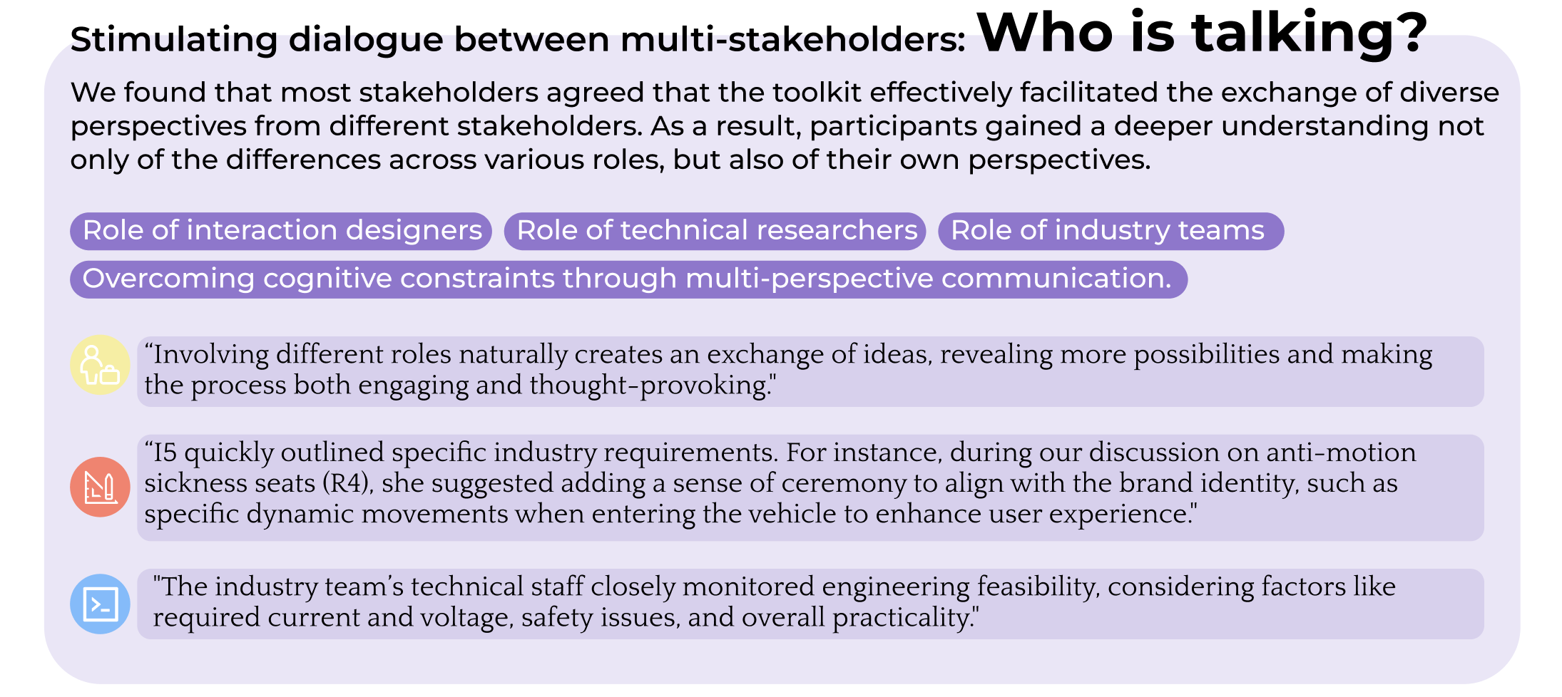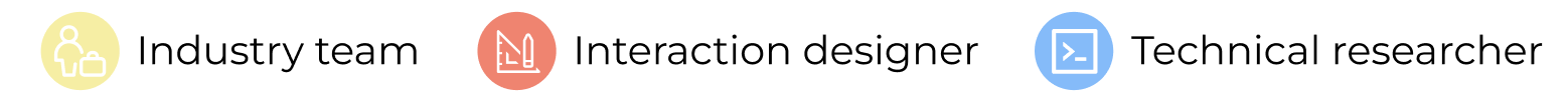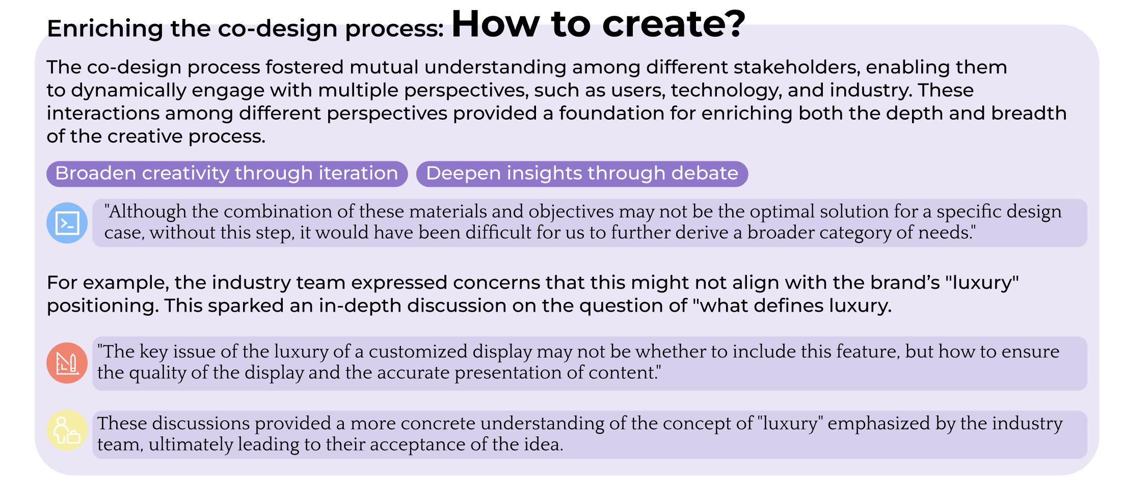 After a pilot study with a focus group involving both the core members from our research team (including technical and design researchers), as well as a specific industry team from a leading automotive brand, focusing on automotive interior design, we identified three primary stakeholders in this study: technical researchers, interaction designers, and specific industry teams, along with their roles that might be essential and irreplaceable within the co-design process.