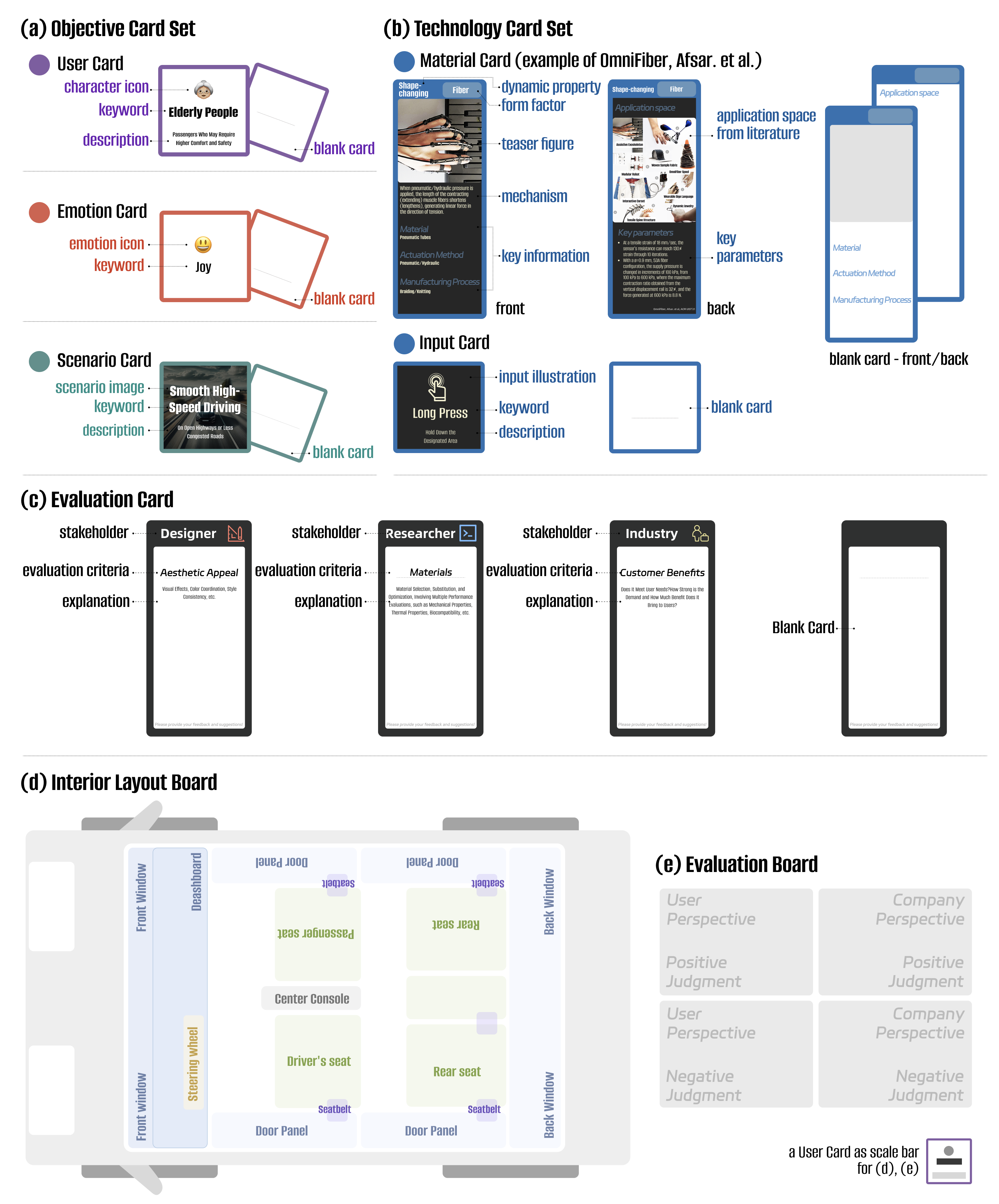 We introduced the card-based toolkit tailored for the co-design process of smart material applications in automotive interiors, involving multiple stakeholders of technical researchers, interaction designers, and the industry team. The card-based toolkit includes: (a) Objective Card Set, (b) Technology Card Set, (c) Evaluation Card, (d) Interior Layout Board, and (e) Evaluation Board. Each card set is provided with multiple keywords or items for using. A full-set printed version of our card toolkit could be downloaded from this Supplemental Material A.